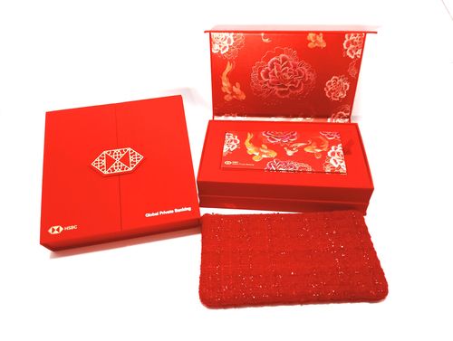 At HSBC's private banking arm, its red packet design this year contains the koi as a symbol of elegance, tranquillity and good fortune, alongside the peony, also known as the «king of flowers». In addition to a woven pouch, the envelopes come with a simple and sleek box that features a stylized version of HSBC’s iconic hexagon logo.