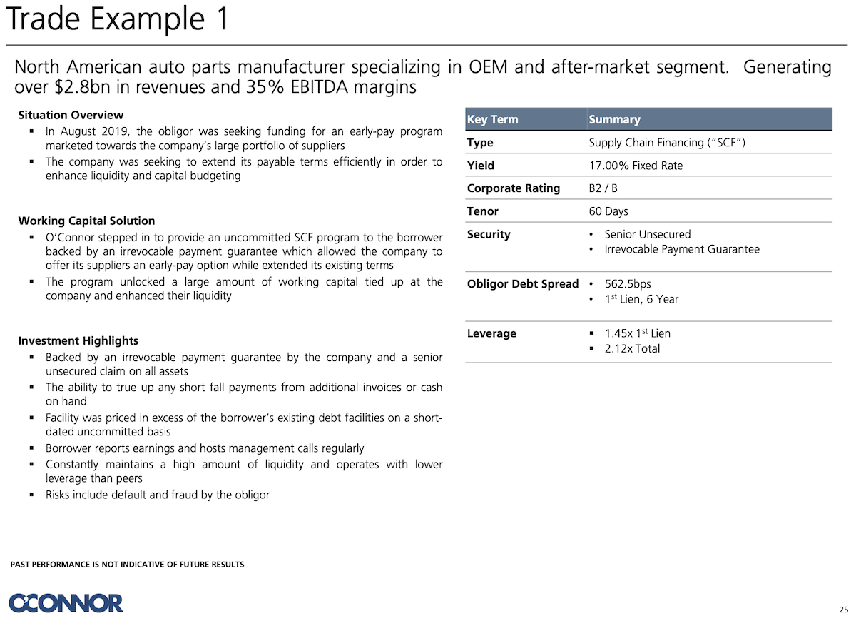 On slide 25 («Trade Example 1»), the deck showcases a North American auto-parts manufacturer active in OEM and aftermarket, citing over $2.8 billion in revenue and a 35 percent EBITDA margin. It describes an uncommitted supply-chain-finance program begun in August 2019 to extend payables, with a fixed yield of 17 percent, 60-day tenor, and a B2 / B corporate rating.
