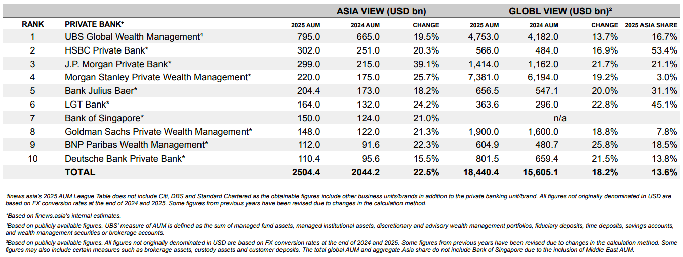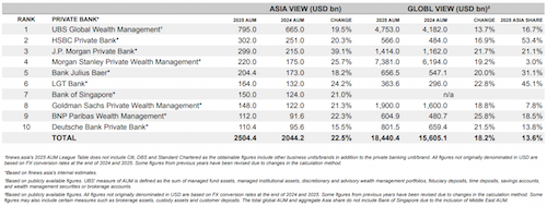 The growth of assets under management among Asia’s top private banks accelerated in 2025 to surpass $2.5 trillion, according to finews.asia's annual AUM League Table, marking the third consecutive year of expansion since the pandemic.