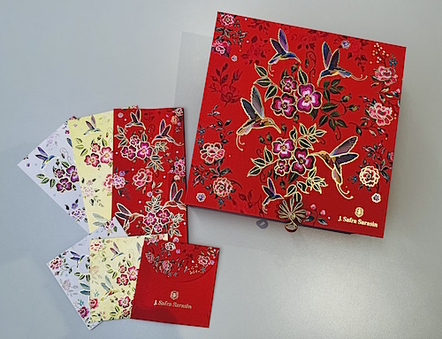 J. Safra Sarasin’s red packet gift set for 2025 embodies a vibrant and festive spirit, featuring a flowery motif accentuated by a rich palette of gold and red, symbolizing prosperity and celebration. To enhance the liveliness of the design, delicate birds are incorporated, bringing a touch of whimsy and joy. The patterns feature a texture that mimics traditional Chinese knitting, enhancing the overall aesthetic with depth.