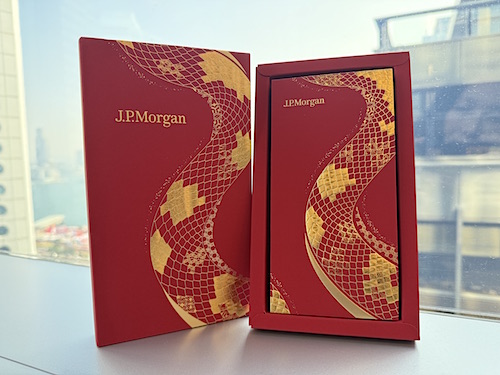 The hongbaos of J.P. Morgan Private Bank are specially designed to honor the transformative spirit of the snake which is known for its ability to shed its skin, embodying clarity and renewal. It includes a harmonious blend of simplicity and elegance, featuring timeless hues of red and gold with modern geometric patterns that symbolize prosperity and good fortune.