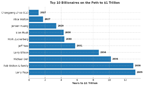 Larry Page rounds out the top 10. With $144 billion and a steadier 16 percent annual growth, the Google co-founder could cross the trillion-dollar mark by 2039.
